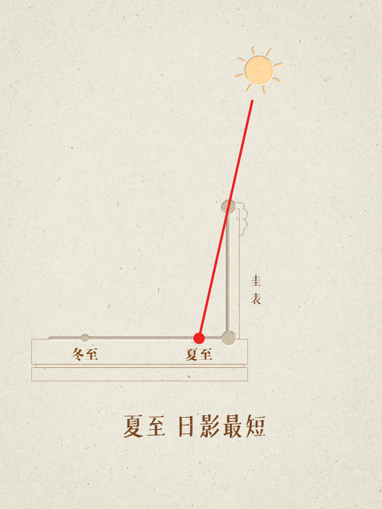 古人通過立桿測影來觀察正午陽光影子的長度,發(fā)現(xiàn)一年中,冬天影子最長的那天就是冬至。夏天里影子最短的那天就是夏至。而春天和秋天里,各有一天白天和夜晚的時間長度一樣,于是就找到了春分和秋分。從此我們有了春夏秋冬四時。