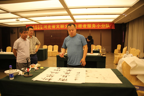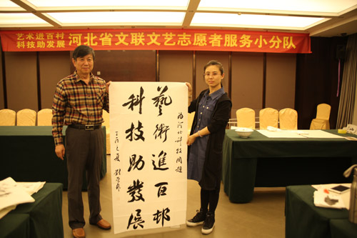 省文聯在活動周期間,組織藝術家以書法的形式相繼在石家莊、承德圍場滿族蒙古族自治縣等地開展文化科技志愿服務活動,用群眾喜聞樂見的藝術形式普及科學知識,傳播科學思想,弘揚科學精神。書法家們創(chuàng)作了數十幅宣傳科普知識的作品贈送給當地鄉(xiāng)村,為百姓提振科技創(chuàng)新、弘揚科普知識、增加農村農業(yè)發(fā)展、提高農民收入提供了有力的精神支撐。