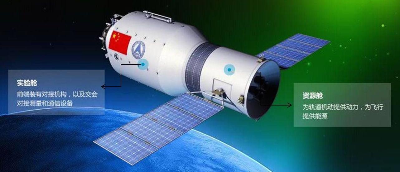 天宮一號目標(biāo)飛行器為全新研制,采用實驗艙和資源艙兩艙構(gòu)型,全長10.4米,艙體最大直徑3.35米,起飛質(zhì)量8506千克,設(shè)計在軌壽命2年。實驗艙由密封艙和非密封后錐段組成,密封艙有效活動空間約15立方米,可滿足3名航天員在艙內(nèi)工作和生活需要;非密封后錐段安裝遙感試驗設(shè)備。實驗艙前端安裝被動對接機(jī)構(gòu)及交會對接測量合作目標(biāo),與飛船對接后,可形成直徑0.8米的轉(zhuǎn)移通道。資源艙為柱狀非密封艙,配置推進(jìn)系統(tǒng)、太陽電池翼等,為空間飛行提供動力和能源。